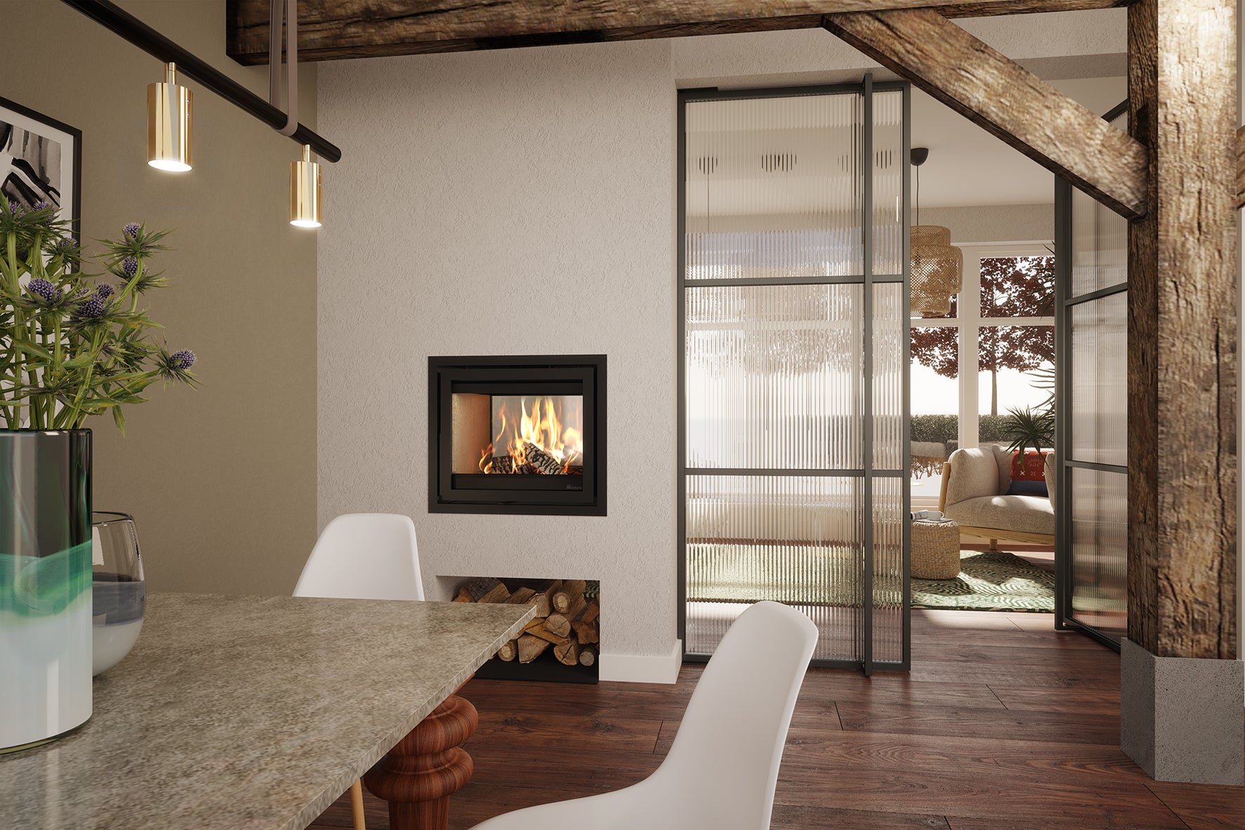 The Prostyle Tunnel is designed for a clear view of the flames from two sides. This stove combines strong performance with a clean, contemporary look, making it ideal for use as a room divider in open interiors. Its high output ensures efficient heating, while the simple design keeps the focus on the fire itself.