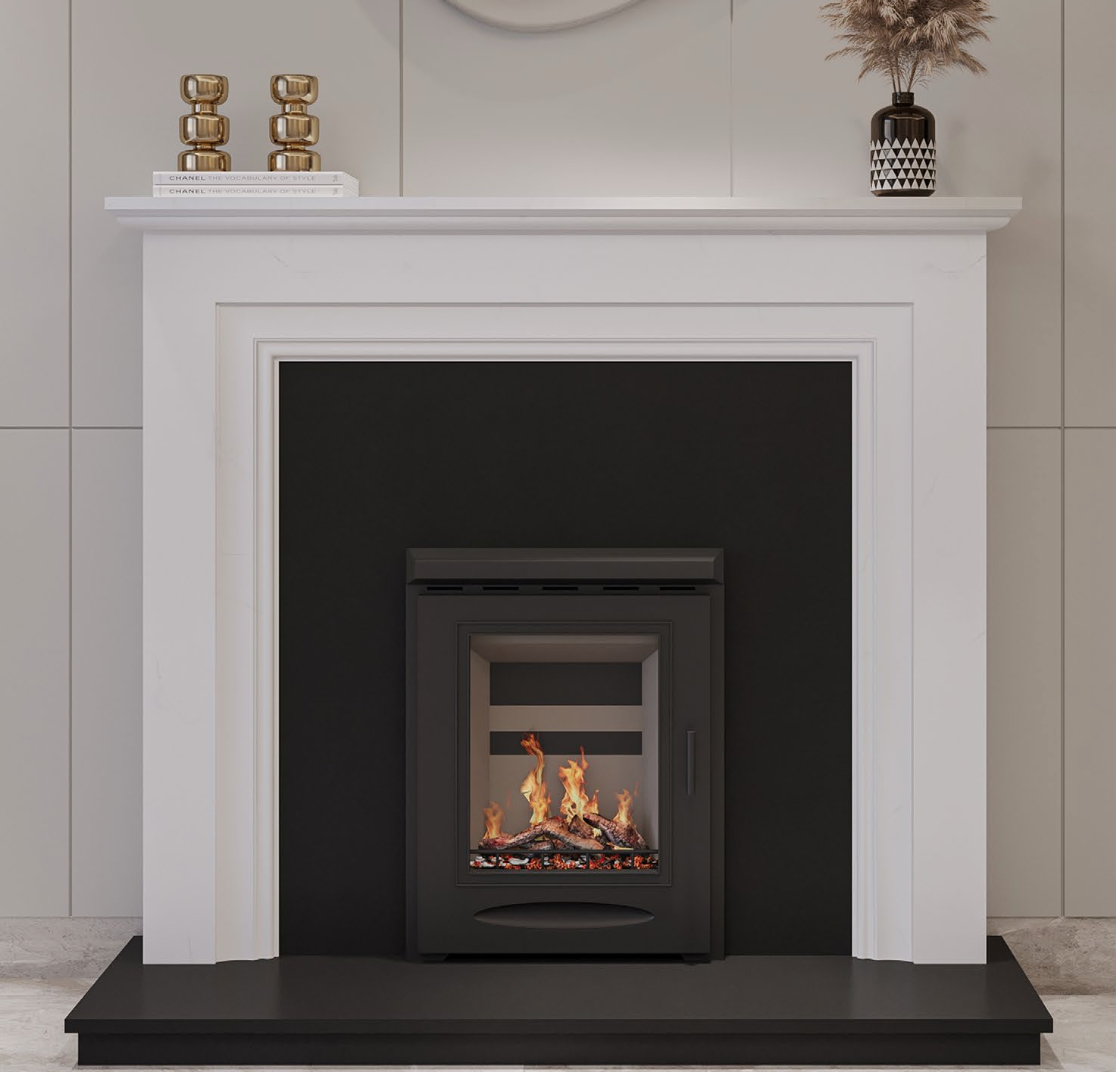 Every fireplace comes with a standard black granite hearth and backpanel